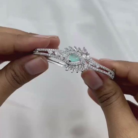 - Design: Elegant kada bracelet with a central aqua teardrop stone, surrounded by shimmering AD diamonds in a radiant floral arrangement.