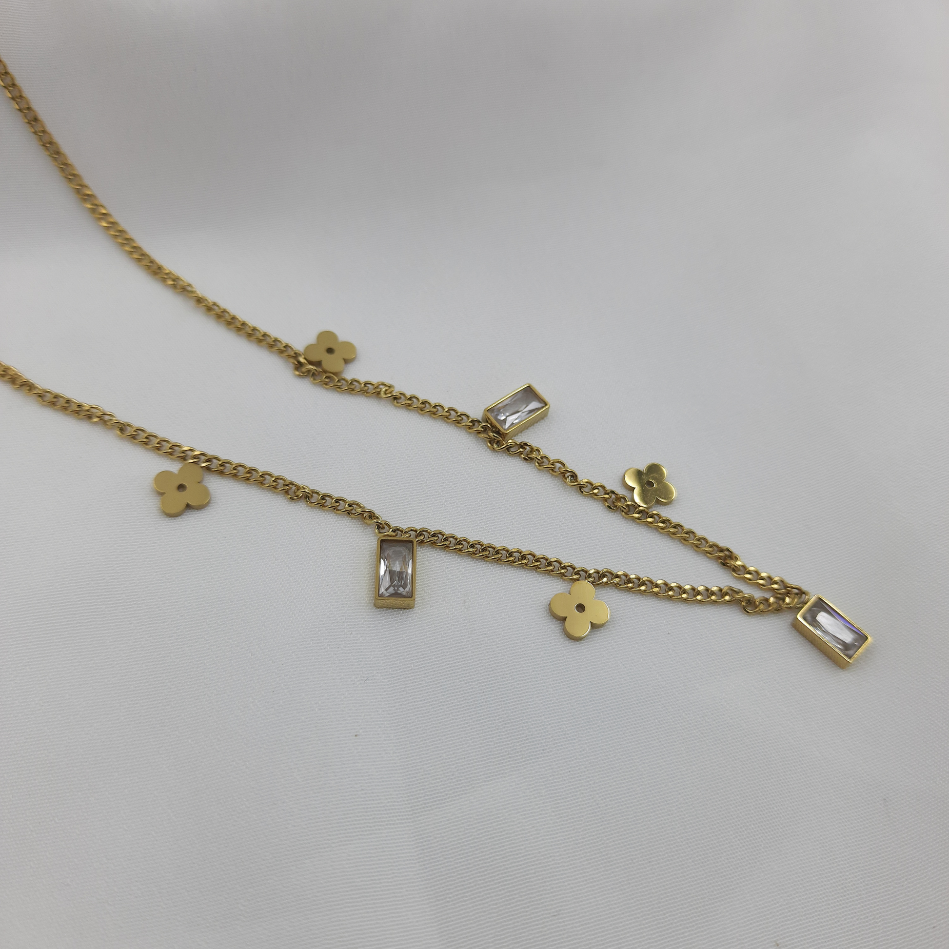 - Design: Elegant dual-layer necklace with alternating floral and rectangular crystal charms.